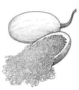 vegetable spaghetti originally (in the 1930s) an American cultivar of the squashC. pepo; also known as spaghetti squash or noodle squash. The ripe fruits are ochre/light buff in colour, about 24 cm (9") long and 0.75 kg (1.5 lb) or more in weight. What is special about them is that the stringy fibres, which in a normal squash form a small layer between the flesh and the seeds, are over-developed so that they take up most of the inside and look and handle remarkably like spaghetti. The taste is bland, so this vegetable goes best with something which has a stronger flavour.