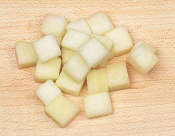 This cut is tile-shaped or triangular, usually cut from jardinière sliced 1 to 2 millimeters (1/32 to 1/16 inch) thick, or it may also be cut without preshaping the item. Vegetables cut into paysanne are most often used for soups called potages taillés.
