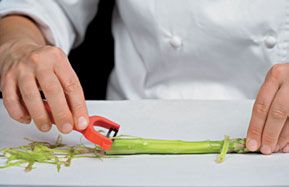 Rotate and continue peeling, maintaining even pressure with every stroke of the peeler so that the natural shape of the stalk is not distorted.