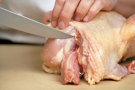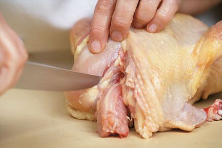 To remove the wishbone, push the skin back on the breast. Make a small cut on either side of the bone and scrape. Reach into the incision with your fingers, forcing the meat away from the bone. Gently remove the bone, working carefully to prevent accidental breakage.