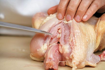 In the case of whole, RTC chickens, the prep work usually begins with trimming excess fat. Then the wishbone is removed, because this facilitates removal of the breast meat, both raw (for scaloppine) and cooked.