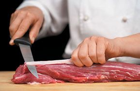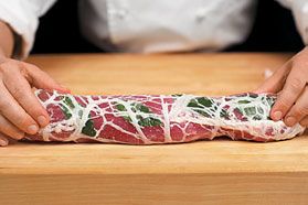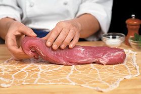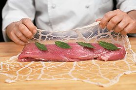 Lay a sheet of caulfat on the work surface. Season the meat and place any aromatics on the meat (in this case, bay leaves). Place a tenderloin at one end (folding under the thin end to equalize diameter) and roll, giving it two turns to completely encase the pork in the membrane. Cut off excess caulfat.
