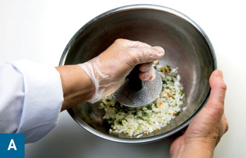 - Using a pestle, potato masher, or mallet, pound the aromatics into a rough paste (A).