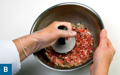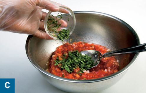 - Add the tomatoes (or other main ingredient vegetable or fruit) to the aromatics paste, and pound or grind into a rough purée (B).