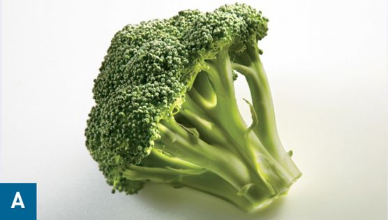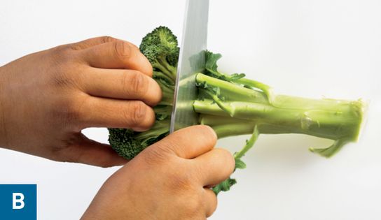 To make a broccoli crown, cut the stalk just below the place where it branches out (A).