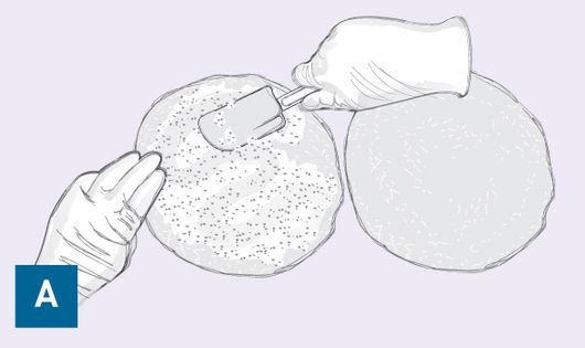 2. Apply the spread to the upper surfaces of the flatbreads in an even layer extending to ½ in. (1 cm) from the edges (A).