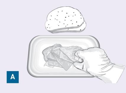 2. Arrange the sandwich filling on the oven tray or on a sizzle plate in the shape of the bread product to be used (A). Fluff deli meats for best mouthfeel. Do not add cheese at this time.