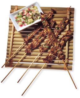 Let the Turks have their shish kebab, the French, their brochettes. I raise my skewer to saté. This tiny kebab is the meat-on-a-stick of choice throughout Southeast Asia, and its explosive flavor and diminutive single-bite size make it a perfect hors d’oeuvre for a cookout. Satés are fun to eat—in part because they’re so small (it takes a lot of them to fill you up) and in part because the flavorings are so varied and intense. Here’s a beef saté seasoned with an explosive mixture of lemongrass, garlic, chiles, and Asian fish sauce and sprinkled with cilantro and chopped toasted peanuts.