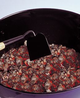 Using a garden hoe or other long-handled implement, rake the burning coals into an even layer.