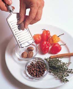 Here are some of the defining flavors of jerk seasoning (clockwise from the top): Scotch bonnet chiles, cinnamon, fresh thyme, allspice berries, and nutmeg. For the freshest taste of spice, grate the latter on a nutmeg or cheese grater.