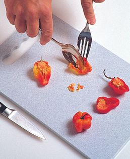 Whole Scotch bonnet chiles are too hot to handle for most people. Hold the chiles with a fork and seed with a spoon to keep the virulent juices off your fingers.