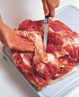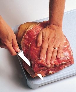 To butterfly a shoulder ham, make a cut in the side of the ham to the bone, holding the knife parallel to the cutting board.