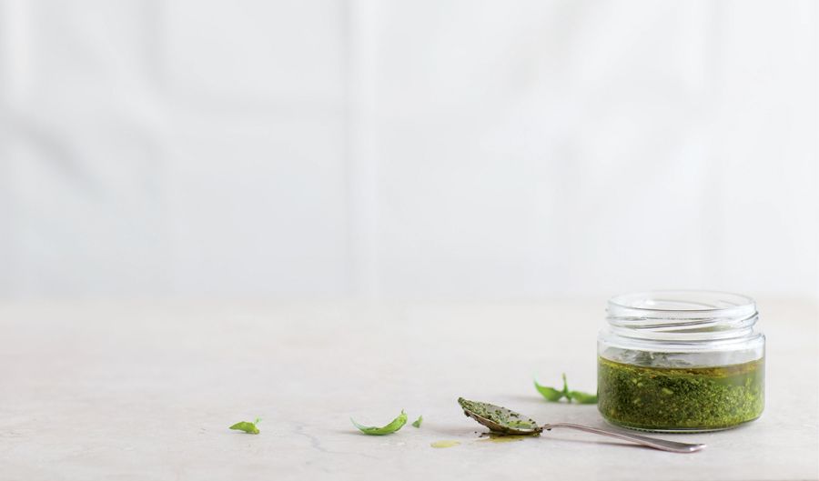 Combine 1 cup (1 oz /30 g) tightly packed basil leaves; 1 clove garlic; ¼ cup (2 fl oz /60 ml) olive oil; 2 tablespoons toasted pine nuts; ¼ teaspoon salt; and several grindings of pepper in a blender or food processor. Whirl the ingredients until a coarse paste forms. Stir in ⅓ cup (1½ oz /45 g) grated Parmesan cheese . Store in an airtight container in the refrigerator for up to 2 days or in the freezer for up to 3 months (ice-cube trays work well for freezing). Toss with cooked whole- wheat pasta, leftover poached salmon or shredded cooked chicken, and halved cherry tomatoes for a quick dinner.