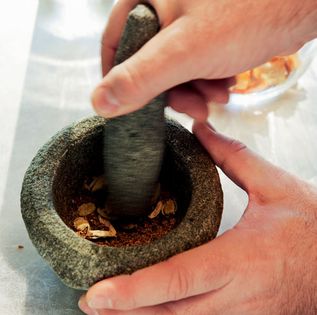 In a mortar, combine 1 tbsp anise seeds and 8 cardamom pods and bruise them roughly.