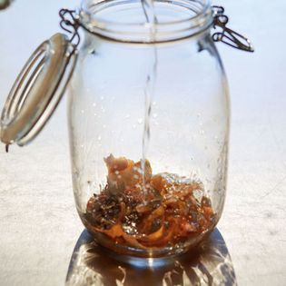 Place the bruised seeds in a big jar (at least 1 pint/½ liter) with 3 tbsp lemon juice and the dried citrus zest. Add 2 cups (500 ml) vodka.