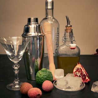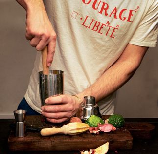 You need: ¼ pomegranate, 2 lychees, 2 parts cachaça, 1 part “Sophie’s syrup” (for that, boil 1 cup [250 ml] water, 1¼ cups [250 g] sugar, grated zest of 1 lemon and ½ orange, and seeds from 1 vanilla bean; strain and let cool, then stir in ⅓ cup [75 ml] rum), juice of 1 lemon, and a handful of ice cubes.