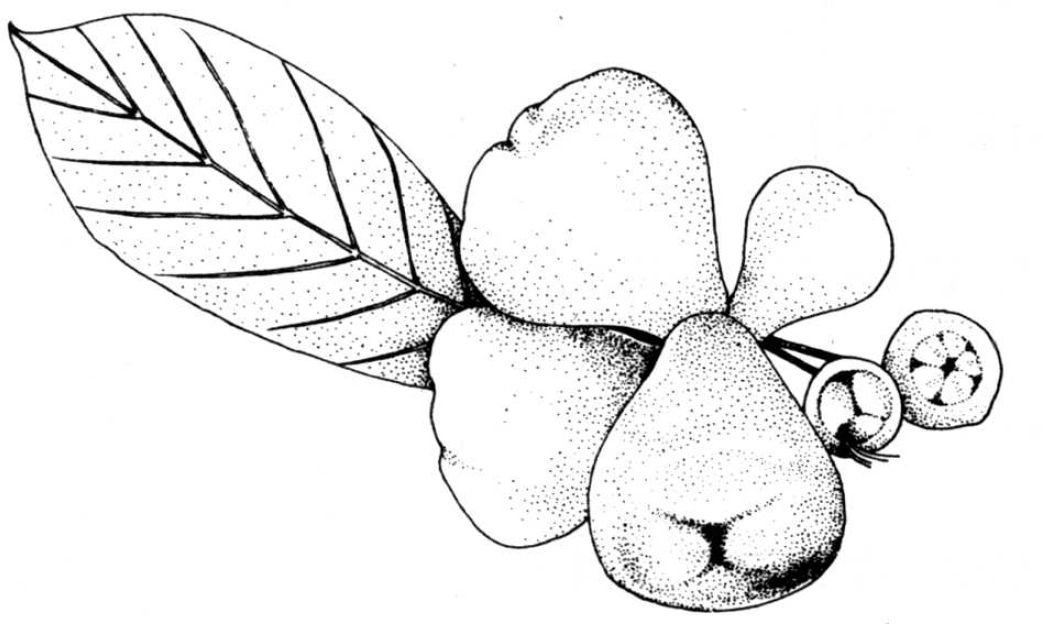 Eugenia aquea (‘water jambu’; also jambu air mawar, ‘rose water jambu’). This tree bears white or pinkish fruits, very juicy and slightly scented.