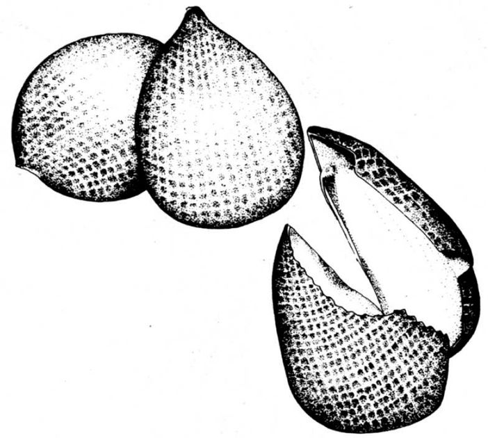 Zalacca edulis. This is a most attractive pear-shaped fruit that grows on a stemless palm. It has a shiny brown tesselated skin, rather like snakeskin, which peels off easily. The flesh inside is segmented, white, and somewhat dry and waxy, but very good to eat provided you do not get salak which contains too much tannin. Salak from Bali are usually reckoned to be the best and sweetest.