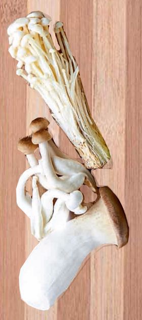 There are many varieties of Japanese mushrooms that are widely available. They are all good to use in hotpots and soups. Enoki mushrooms are white in colour and have long, thin stems. They have a nice crunchy texture when you bite them. There are two kinds of shimeji; one is brown and the other is white. Oyster mushrooms and king oyster mushrooms are also often used in Japanese cooking.