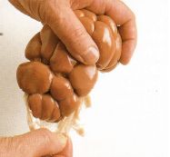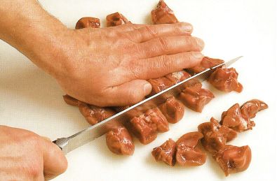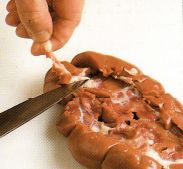 - Calf’s, pig’s or beef kidneys are cut into cubes for cooking. (First make sure the ducts have been removed completely from the center.)