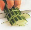 2 For crescents: peel the cucumber in strips as for cups, halve it, and, if you like, scoop out the seeds. Cut the cucumber in thin crosswise slices.