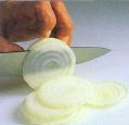 Peel a large onion, trimming the stem and root. Turn the onion on its side, hold it securely on the board with one hand and cut thick or thin slices in downward strokes. Leave the slices whole or push them apart into rings.