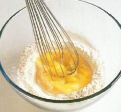 Sift the flour into a bowl with salt (and sugar, if using) and make a well in the center. Break the eggs into the well and whisk them until they are thoroughly mixed.