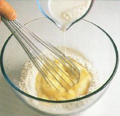 Thin the paste to the desired consistency with more liquid: a thick cream is needed for many pancakes, fritters and for binding ingredients, and a thinner cream is required for crêpes.