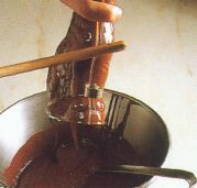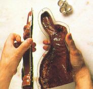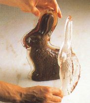 If using couverture chocolate, a cold room (not more than 60°F/16°C) is essential. All utensils must be clean, dry and at room temperature. Here, a rabbit mold is shown.