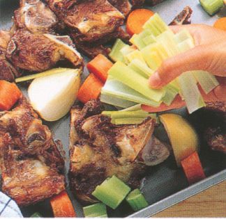 Roast 1.5 kg (3 lb) beef or veal bones at very hot 230°C (450°F/Gas 8) for 40 minutes, adding a quartered onion, 2 chopped carrots, 1 chopped leek and 1 chopped celery stick halfway through.
