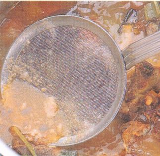 Ladle the stock in batches into a fine sieve over a bowl. Gently press the solids with the ladle to extract all the liquid and place in the refrigerator to cool. Lift off any solidified fat. Makes 1.5–2 litres