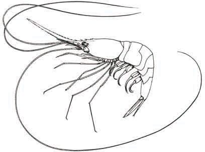 This, the largest of a family of small prawns (some very small), attains a length of 12 cm, not including the long rostrum or beak. The next largest is Parapandalus narval (Fabricius), which has less prominent teeth along the top of its rostrum. It is shown below.