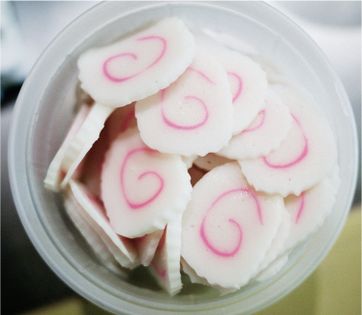 Fish cakes, pressed protein creations derived from pollock or haddock or other mild-to-flavourless fish, are there to add colour and texture. You can sometimes find them in the freezer case at Japanese food shops; if not, omit them. Defrost the frozen fish cakes and cut them into 3mm-thin slices.