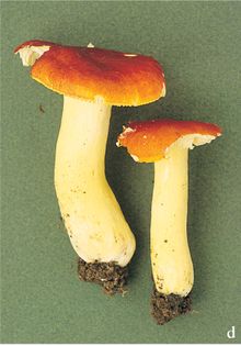 Gilded Brittlegill Russula aurea Pers. syn. R. aurata (With.) Fr. (illustrated 40% life size) Cap 4–9cm across, globose at first, then flattening and finally with a depression, margin often furrowed when mature; scarlet-red, brownish-coral, blood-coloured, or reddish-orange, often partly or entirely golden-yellow; fleshy, firm, sticky when moist, smooth; half peeling. Stem 30–80×10–25mm, cylindrical to somewhat club-shaped, often somewhat irregular; white to pale yellow to pale golden-yellow; firm then soft, smooth. Flesh taste mild. Gills adnexed-free, broad, fairly widely spaced, connected by veins at their bases; pale ochre, edge often yellow. Spores 7.5–9×6–8µ, globose-ovate; conical warts up to 0.7–1.5µ high, with thin to thick connecting ridges forming a partial network enclosing a few meshes. Spore print ochre (H). Cap hyphae tapering, cylindrical, spindle-shaped, or slightly club-shaped, with shortish cells; dermatocystidia and hyphae staining in fuchsin absent. Habitat with broad-leaved trees; summer to early autumn. Uncommon. Edible.