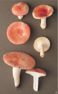 Russula luteotacta Rea (illustrated 60% life size) Cap 3–8cm across, flattened convex, later with a depression to shallowly funnel-shaped; red or pink, often with white areas; soon dry, matt; hardly peeling. Stem 30–70×5–15mm, club-shaped or narrowing upwards; white or tinted pink in places to completely red. Flesh white; taste hot, smell slight, fragrant, sometimes suggesting coconut. Gills usually slightly but distinctly decurrent, narrow; pale cream. All parts can turn bright yellow on bruising, but often only after several hours. Spores 7–9×6–7.5µ; warts up to 0.7µ high, mostly isolated, very occasionally joined by fine lines. Spore print whitish (A). Cap cystidia cylindrical, spindle-shaped, or narrowly club-shaped; cap surface hyphae cylindrical or tapering. Habitat with broad-leaved trees, especially on wet clay; summer to autumn. Occasional. Poisonous.