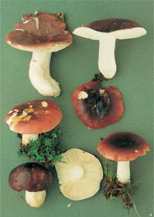 Purple Brittlegill Russula atropurpurea (Krombh.) Britzelm. (illustrated 50% life size) Cap 4–10cm across, convex, later flattening and with a slight depression; usually deep purplish-red with a darker, often almost black centre, at times variously mottled with yellowish- or brownish-cream; sticky when moist. Stem 30–60×10–20mm; white, often becoming greyish with age; fairly firm at first, later softer and easily broken. Flesh white; taste from almost mild to moderately hot, smell slightly fruity, reminiscent of apples. Gills adnexed, closely spaced, fairly broad; palish cream. Spores 7–9×6–7µ, ovate; warts joined by fine ridges to form a well-developed but not quite complete network. Spore print whitish (A–B). Cap cystidia abundant, cylindrical to somewhat club-shaped, without septa. Habitat usually with oak or beech, less commonly conifers; summer to late autumn. Very common. Edible if cooked. Note although the name R. atropurpurea is accepted to be incorrect, none of the proposed changes (such as R. krombholzii) has been found to be acceptable by many mycologists.