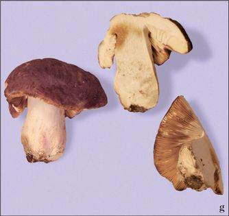 Russula amarissima Romagn. & E.-J. Gilbert. (illustrated 35% life size) Cap 5–14cm across, rounded then convex; red, darkish, sometimes with ochre tints or even cinnamon; fleshy, firm; hardly peeling. Stem 45–100×16–36mm, equal; white, flushed pink or pinkish-vinaceous in part, sometimes with brownish marks; hard, spongy in the centre. Flesh white; thick, firm; smell pleasant, slightly of flour, taste very bitter. Gills rather close, strongly interveined; white, edges near the stem discolouring reddish. Spores 7–9×6.5–8µ, ovate; warts up to 1.5µ high, connectives irregular, rarely forming a reticulum. Spore print pale cream (B). Habitat in mixed woods; late summer to autumn. Very rare on Red Data List. Not edible far too bitter to consider. Note photographed by Geoffrey Kibby.