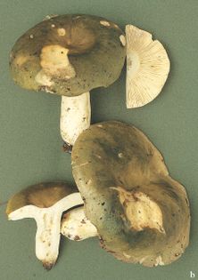 Charcoal Burner Russula cyanoxantha (Schaeff.) Fr. (illustrated 50% life size) Fr. Cap 5–15cm across, first globose, later flattening to depressed at the centre; sometimes one colour but usually a mixture, dullish lilac, purplish, wine-coloured, olive, greenish, or brownish, sometimes entirely green (sometimes separated into f. peltereaui Singer), with faint, branching veins radiating from centre; firm to hard, greasy when moist; half peeling. Stem 50–100×15–30mm; white, sometimes flushed purple; giving no or a slightly greenish reaction when rubbed with iron salts, not salmon as in most Russulas; hard. Flesh white; taste mild. Gills adnexed to slightly decurrent, whitish to very pale cream, rather narrow; oily to the touch, flexible, not brittle as in most Russulas, forked at times. Spores 7–9×6–7µ, broadly elliptical; low warts, up to 0.6µ high; fine lines absent. Spore print whitish (A). Cap cystidia scattered, small, short and narrow (2–4µ), cylindrical, teat-ended. Habitat with broad-leaved trees; summer to late autumn. Very common. Edible good.