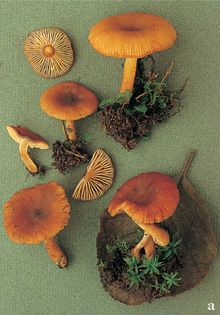 Lactarius omphaliformis Romagn. (illustrated 100% life size) Very similar to L. obscuratus, with a larger and brighter cap. Cap 13–17mm across, or even reaching 35mm, centre often wrinkled and lumpy; tawny to russet or cinnamon, without olive tinges, sometimes with darker centre. Stem 16–40×2–4mm; pale tawny. Flesh pallid; very thin in the cap. Gills more distinctly decurrent and thicker, well spaced. Milk white. Spores 6.5–7.5×5.2–6.5¼; ornamented like L. obscuratus. Habitat with alder and birch; late summer to autumn. Very rare. Not edible. Note in my first book I published this under the name Lactarius cyathula (Fr.) Fr. as per the New Check List (1960), but this name is now considered to be a nomen confusem.