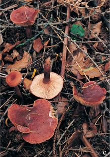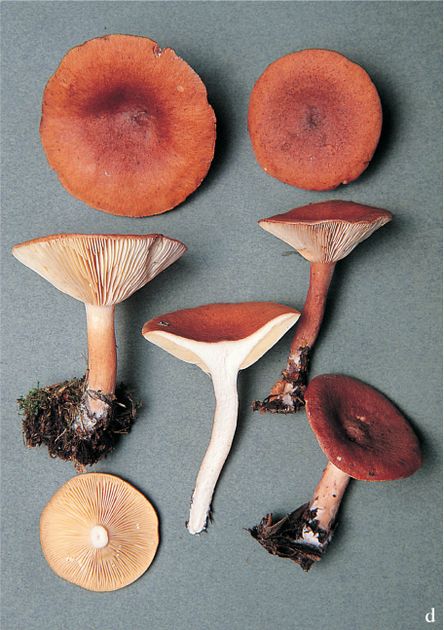 Rufous Milkcap Lactarius rufus (Scop.) Fr. (illustrated 45% life size) Cap 3–10cm across, convex, later flattening, finally with a central depression, the centre usually with a pointed umbo, margin somewhat inrolled at first; bay, red-brown, or dark brick; moderately thick, surface dry and matt. Stem 40–80×5–20mm; concolorous with cap but paler; often hollow when old. Flesh white; breaking fairly easily. Gills somewhat decurrent; yellowish at first, later as cap but paler; brittle. Milk white; taste mild then after about a minute very hot and acrid. Spores 8–9.5×6.5–7.5¼, elliptical; warts occasionally isolated but mainly connected by thin ridges to form a rather incomplete network. Spore print creamy whitish (B) with slight salmon tinge. Habitat with pine; late spring to late autumn. Common. Not edible although in some places it is used as a seasoning after special treatment.
