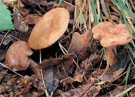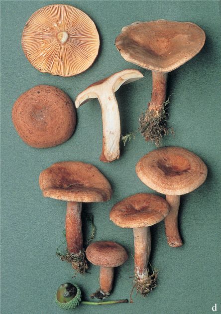 Oakbug Milkcap Lactarius quietus (Fr.) Fr. (illustrated 50% life size) Cap 3–8cm across, convex, later flattened or with a shallow depression; dull reddish-brown with cinnamon tints, often with a few indistinct darker concentric bands or spotting; dry and matt, not sticky when moist. Stem 40–90×10–15mm, more or less cylindrical; coloured as cap or darker; often hollow, often furrowed lengthwise, matt. Flesh whitish buff; thick and firm in cap. Gills slightly decurrent; brownish white, later pale reddish-brown with a slight mauvy bloom. Milk white or slightly creamy; taste mild or slightly bitterish, smell slightly oily or suggesting bugs. Spores 7.5–9×6.5–7.5¼, ovate; warts mostly joined by ridges forming a well-developed network. Spore print cream (C) with slight salmon tinge. Habitat with oak; autumn. Very common. Edible.