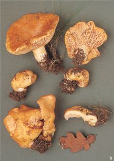 Lactarius acerrimus Britzelm. (illustrated 35% life size) Cap 8–15cm across, somewhat globose when young, becoming convex and eventually funnel- or crater-shaped, often strongly and rather irregularly waved or lobed, margin inrolled at first, very soon hairless; buff, often with an ochre or yellowish tint, paler at the margin, usually with several ill-defined ochre to tawny concentric bands; very firm, slightly sticky when moist. Stem 20–60×20–40mm, short and thick, frequently excentric to almost lateral; whitish, later mottled or entirely buff to pale ochre; solid or with one or more small cavities. Flesh whitish; very firm. Gills slightly decurrent, well-spaced, the sides strongly reticulately wrinkled, the wrinkles often joining the gills and giving a pore-like appearance near the stem and the cap margin; rosy buff, later tawny or cinnamon. Milk white; taste burning hot, smell fruity, suggesting overripe pears. Spores 10.5–13.5×8.5–10¼, ovate; strong warts joined by thick ridges or thin lines to form a fairly well-developed but rather incomplete network unusually large for a Lactarius. Spore print deep cream (D–E). Basidia two-spored. Habitat with broad-leaved trees, especially oak; summer to early autumn. Uncommon. Unknown edibility.