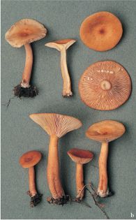 Birch Milkcap Lactarius tabidus Fr. syn. L. theiogalus sensu auct. (illustrated 60% life size) Cap 2–4cm across, shallowly convex with a central depression, often with a pimple in the middle; dull ochre-buff to yellowish-rust or dull orange-ochre; somewhat fragile, surface matt, not sticky, often with small wrinkles. Stem 30–50×4–10mm, cylindrical or narrowing upwards; coloured as the cap above, more brick below; fairly rigid but easily broken, becoming hollow. Flesh whitish; thin in cap. Gills slightly decurrent, crowded; pale yellowish-cinnamon with a rosy tinge. Milk white, rather scanty, a drop on a handkerchief turns slowly yellow; taste almost mild, but slightly hot and acrid. Spores 7–9.5×6–7¼, elliptical; warts mainly isolated and only a few joined by fine ridges. Spore print pale cream (B) with a slight salmon tinge. Cap surfaces cellular. Habitat with deciduous trees, especially birch, and in moist places; late summer to late autumn. Very common. Toxicity not edible.