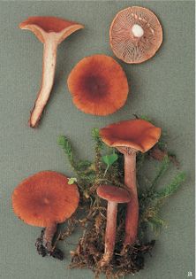 Curry Milkcap Lactarius camphoratus (Bull.) Fr. (illustrated 50% life size) Cap 2.5–5cm across, convex, then with a depression and often with a small umbo, margin slightly inrolled at first, often furrowed; red-brown, bay, or dark brick, sometimes with a violet tinge; surface smooth and matt, not sticky. Stem 30–50×4–7mm, cylindrical or narrowing downwards; coloured as the cap or deeper. Flesh pale rusty brown. Gills decurrent, closely spaced, narrow; pale reddish-brown. Milk rather watery but with whitish clouds; taste mild, smell weakly of bugs when fresh, but a strong curry-like scent develops on drying. Spores 7.5–8.5×6.5–7.5¼, subglobose; warts mainly isolated but occasionally joined by ridges. Spore print creamy (C). Habitat with pine but sometimes also in deciduous woods; summer to late autumn. Common. Edible used dried and powdered as a flavouring in Germany.