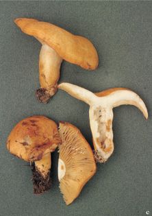 Lactarius bresadolianus Singer. (illustrated 50% life size) Cap 3–12cm across, convex and centrally depressed to widely funnel-shaped, margin incurved at first; yellowish-buff to clay-buff, lightly zoned; surface viscid. Stem 25–80×12–25mm; cream, more ochraceous with age; solid. Flesh white; firm; taste very acrid after a few seconds, smell fruity. Gills adnate, a little crowded; pale ochraceous-cream. Milk white, abundant, drying greyish; taste very acrid, after a while also bitter. Spores 8–10×6.8–8.5¼, elliptical; warts small, connected by fine lines in an incomplete network. Spore print pale buff-yellow. Habitat in conifer woods; late summer to early winter. Known from Central Europe and Scandinavia, not recorded for Britain. Not edible. Note some mycologists synonomise this species with L. zonarioides Kühn. & Romagn.