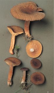 Watery Milkcap Lactarius serifluus (DC.) Fr. (illustrated 90% life size) Cap 3–7cm across, flattened convex with saucer- or narrow funnel-shaped centre, margin remaining incurved for some time, usually more or less furrowed; dull brown; surface dry, matt, wrinkled, and often granular or lumpy. Stem 20–65×7–12mm; concolorous with cap or more usually paler; hollow. Flesh cinnamon-buff; thin in cap. Gills moderately decurrent; saffron to bricky or orangy cinnamon. Milk watery with a few white clouds; taste mild, smell of bugs, oily. Spores 6.5–9×6–8¼; covered with warts up to 1.3¼ high, joined by usually strong almost wing-like ridges to form a more or less complete network. Cap surface cellular; gill margin with globose, ballon or club-shaped cells. Spore print creamy (C) with a slight salmon tinge. Habitat with oak and beech; summer to autumn. Occasional. Not edible. Note in my first book I published this as L. cimicarius.