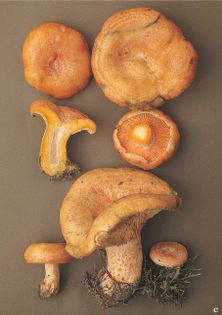 Saffron Milkcap Lactarius deliciosus (L.) Gray (illustrated 50% life size) Cap 3–10cm across, convex then shallowly funnel-shaped, margin incurved at first; numerous small, purplish-brick to salmon blotches in narrow, concentric bands on a pale flesh-coloured or rosy buff background, becoming tinged greenish in places; slightly sticky, firm, brittle. Stem 30–60×15–20mm; pale buff or vinaceous to orangey or salmon, sometimes with darker, shallow, spot-like depressions, becoming green in places. Flesh pale yellowish, carrot in places from the milk after an hour or so, fading, finally dull greyish-green. Gills slightly decurrent, closely spaced; pale pinkish-apricot to saffron, becoming carrot and slowly dull pistachio-green on bruising. Milk carrot; taste mild or slightly bitter. Spores 7–9×6–7¼, elliptical; thin to thickish ridges forming a fairly full network. Spore print pale ochre (F). Habitat with pines; summer to autumn. Frequent. Edible much esteemed in Europe. Note very similar to L. deterrimus (opposite).