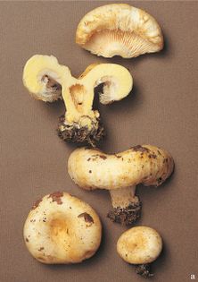 Lactarius citriolens Pouzar. syn. L. cilicioides sensu auct. mult. (illustrated 35% life size) Cap 10–20cm across, convex with a deep, funnel-shaped central depression, margin inrolled; pale yellowish-buff to ochre-buff, with scattered ochre fibrils within its surface, which are thicker, stronger-coloured, and sometimes indistinctly banded towards the margin; hard and thick-fleshed, surface sticky, the fibrils forming a coarse fringe of matted hairs up to 10mm wide on the margin. Stem 40–80×20–45mm, narrowing downwards towards the base or cylindrical; pale yellowish-buff, sometimes with indistinct darker spots; hard and rigid, developing a large cavity. Flesh pale yellow. Gills decurrent; pale pinkish ochre-buff. Milk white, in a few seconds sulphur-yellow; taste moderately hot and acrid. Spores 7.5–8.5×6¼, broadly elliptical to subglobose; fairly full network of both thick and thin ridges and an occasional isolated wart. Spore print pale ochre (D–E) with slight salmon tinge. Habitat with birch; late summer to early autumn. Rare. Suspect avoid.