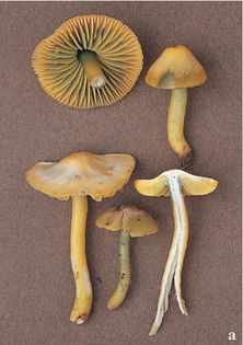 Parrot Waxcap Hygrocybe psittacina (Schaeff.) P. Kumm. syn. Hygrophorus psittacinus (Schaeff.) Fr. (illustrated 70% life size) Cap 1–3cm across, convex or bell-shaped with broad umbo; usually greenish at first, then more yellowish, often with a pinkish tinge at the umbo, often striate at the margin; covered in greenish gluten, especially when young. Stem 20–40×2–5mm; greenish-yellow with darker, greenish-blue apex; very slimy. Flesh white, tinged with green and yellow; smell mushroomy. Gills adnate, broad; yellowish near edge, becoming more green towards cap. Spores 8–9.5×4–5.5¼, ellipsoid. Spore print white. Habitat in grass on lawns or heaths; summer to late autumn. Very common. Edible but not good, due to sliminess.