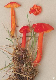 Hygrocybe helobia (Arnolds) Bon. (illustrated life size) Cap 0.5–2cm across, convex; bright scarlet. Stem 20–50×2–5mm; concolorous with cap or more orange; smooth and shiny. Flesh orange-red; thin; taste and smell not distinctive. Gills adnate; yellow to vermillion or orange-red with paler yellow edge. Spores 7.5–10×5–6¼, ellipsoid to egg-shaped. Spore print white. Habitat in grassy clearings in woodland or on heaths; autumn. Occasional. Unknown edibility. Note this fungus was not described until 1974; it was shown as Hygrocybe miniata (Fr.) Kummer in my first book. It can be distinguished from the other small, bright red species in this genus by the very distinct, long gill-trama elements.
